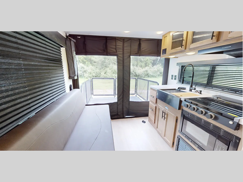 Each Black Label trailer is built with fiberglass gel coat sided walls, frameless windows, and thermofoil insulation for added protection. Inside you will enjoy features such as upgraded solid surface countertops, upgraded reading lights, and designer cushion fabric!