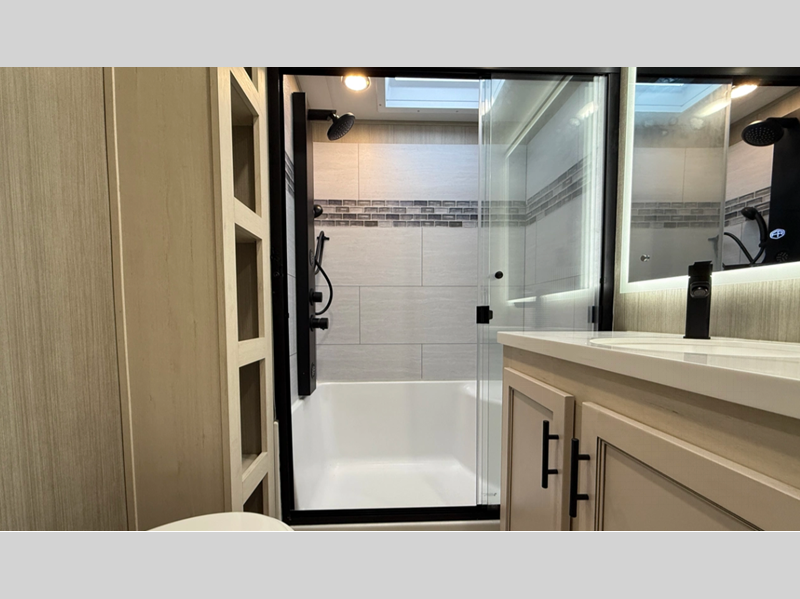 The standard MORryde suspension and hitch plus Goodyear Endurance radial tires will provide a smooth tow from home to campground, and the 6-point hydraulic leveling system will have you set up in no-time! An on-board generator and 600-watt solar system will keep you powered up, and a 30-gallon fuel station lets you fill up and head out whenever the adventure calls. You'll find many interior comforts as well, including luxury upgraded furniture and solid surface countertops throughout, plus a spa shower system in the master bath and upgraded king mattress!