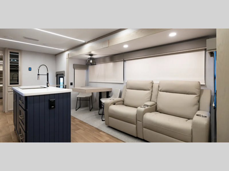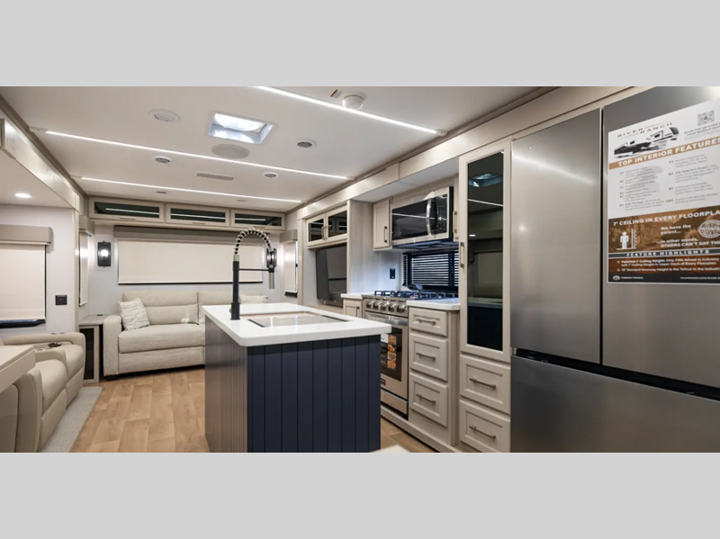 Sleeps 4 Slides 4 Length 42 ft 4 in Ext Width 8 ft 5 in Ext Height 13 ft 6 in Int Height 7 ft Exterior Color Full Body Paint Pearl White and Black (required with paint option) Hitch Weight 2425 lbs GVWR 17999 lbs Dry Weight 14844 lbs Cargo Capacity 3155 lbs Fresh Water Capacity 75 gals Grey Water Capacity 78 gals Black Water Capacity 39 gals Tire Size 16" Furnace BTU 35000 btu Available Beds King Refrigerator Type Stainless Steel 12V Refrigerator Size 18 cu ft Cooktop Burners 4 Shower Size 48" x 30" Number of Awnings 2 Axle Weight 8000 lbs LP Tank Capacity 30 lbs Water Heater Capacity 12 gal AC BTU 45000 btu TV Info LR 50" Smart TV, BR Smart TV Awning Info 15' and 19' Power w/LED Lighting Axle Count 2 Washer/Dryer Available Yes Number of LP Tanks 2 Shower Type Standard Solar Wattage 260 watts Similar Floorplans