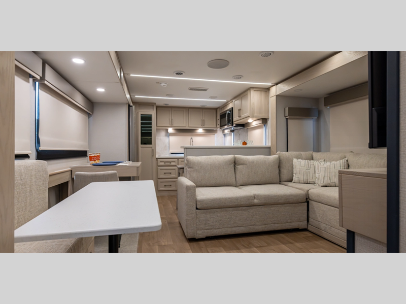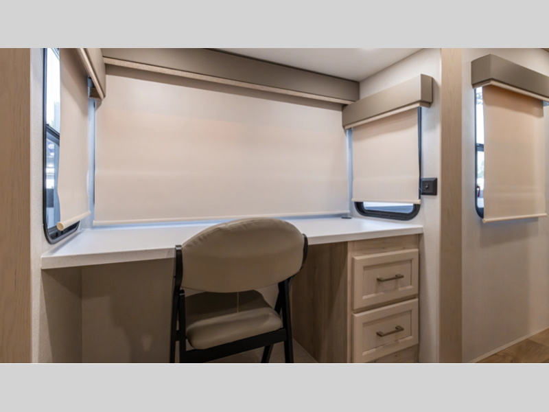 There is a 6-point hydraulic leveling system that will have you set up at camp in no-time, and the slam latches on all storage doors will make it easy to unload your gear. A heated utility convenience center is also found outside, along with a tire pressure monitoring system, a ladder, and slide toppers. Inside, you'll be met with upgraded true solid surface countertops in the bath and kitchen, dimmable ceiling strip lighting, hybrid marine-grade carpet, plus roller day/night shades in the main areas to name a few comforts.