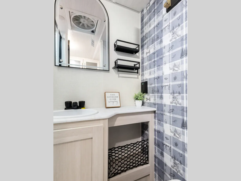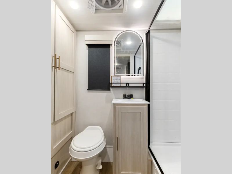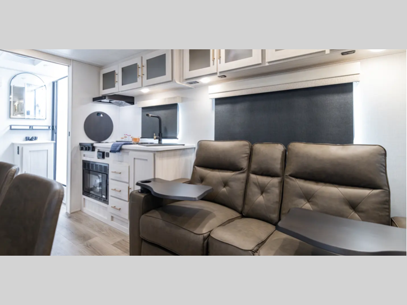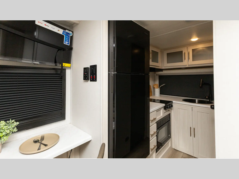 Each one is built with a sealed underbelly with forced heat for added protection against the elements, plus a curved dual-pane acrylic front window with a bug screen and night shade for great outdoor views and natural lighting. You will also find seamless Surf-X kitchen countertops, a central vacuum system, blackout roller shades throughout, and many more comforts.