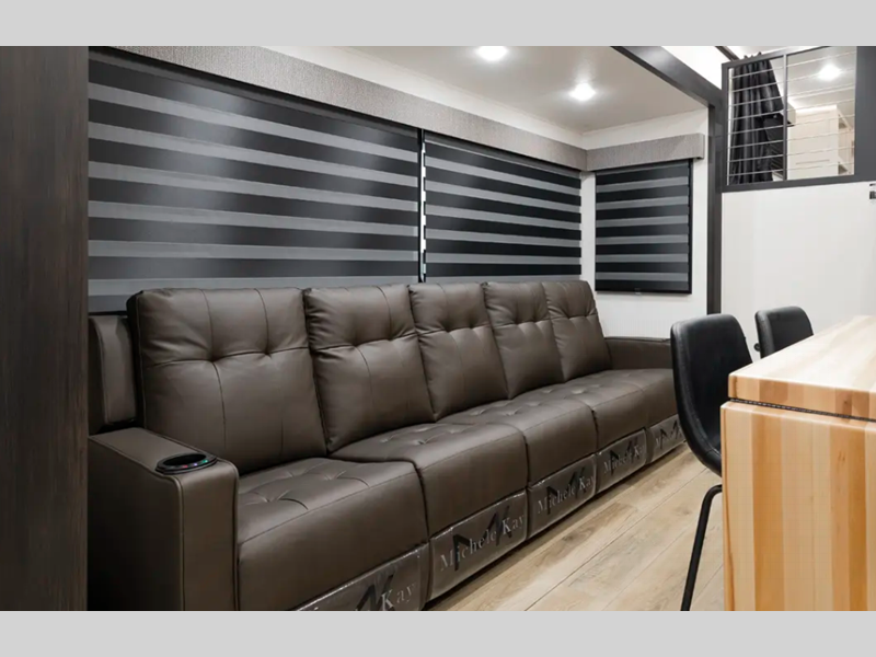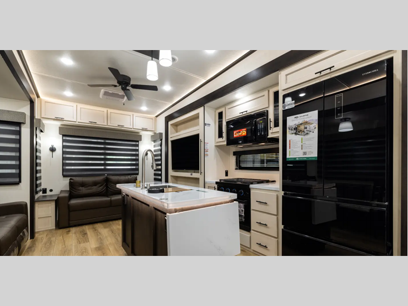 Each model is built durable with vacuum bond laminated sidewalls and a PVC roof membrane, and you'll love the look of the high gloss gel-coat front cap with LED lighting. You can create at-home meals with the fully-equipped kitchen that includes Black Opal appliance accents, a spacious refrigerator, plus a workstation farm style sink. There are even more standard features to make you feel right at home, like the tankless water heater, adjustable stable steps, plus ambient accent lighting in the kitchen and living area.