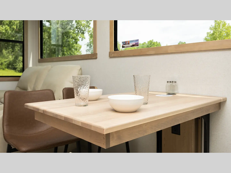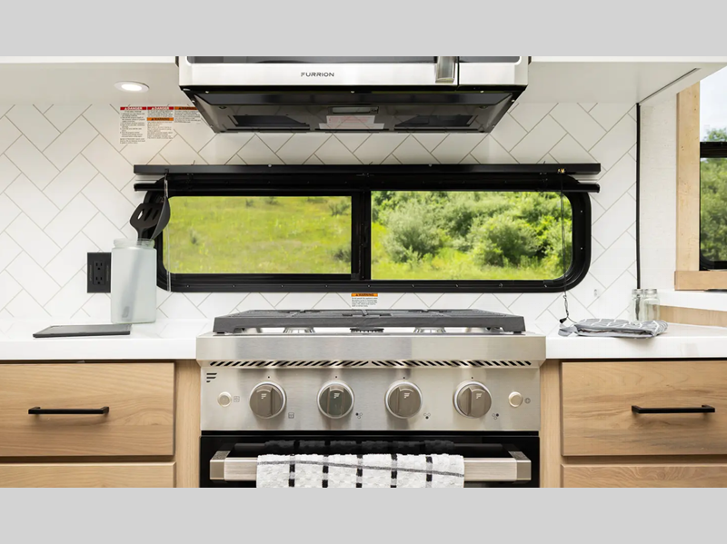 Each destination trailer features a painted full profile fiberglass front cap with a windshield, an underbelly armor, and Lippert auto adjust brakes for a smooth towing experience. Inside, you will love the solid surface kitchen countertops, residential stain resistant carpet, decorative backsplash, and many more comforts.