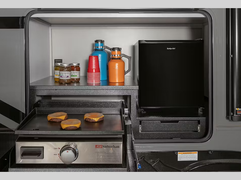 - Water connections, black tank flush, outside shower, winterization valve, low point drains, power tank fill, waste & water handle valves, 110V outlet, shut-off valve, 12V compartment light, KeyTV™ satellite/cable hook-up