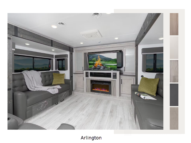 Sleeps 4 Slides 3 Length 34 ft Ext Height 13 ft 4 in Interior Color Arlington, Kingston Hitch Weight 2455 lbs Dry Weight 11692 lbs Cargo Capacity 3608 lbs Fresh Water Capacity 75 gals Grey Water Capacity 88 gals Black Water Capacity 49 gals Tire Size ST235/80R16G Furnace BTU 35000 btu Available Beds King Refrigerator Type GE Energy Star Residential with Ice Maker Refrigerator Size 18 cu ft Cooktop Burners 3 Number of Awnings 2 Axle Weight 7000 lbs LP Tank Capacity 30 lbs Water Heater Type On Demand AC BTU 15000 btu TV Info LR 50" LED Smart TV Awning Info 10' and 16' Electric with LED Lights Axle Count 2 Washer/Dryer Available Yes Number of LP Tanks 2 Shower Type Radius Electrical Service 50 amp Similar Floorplans